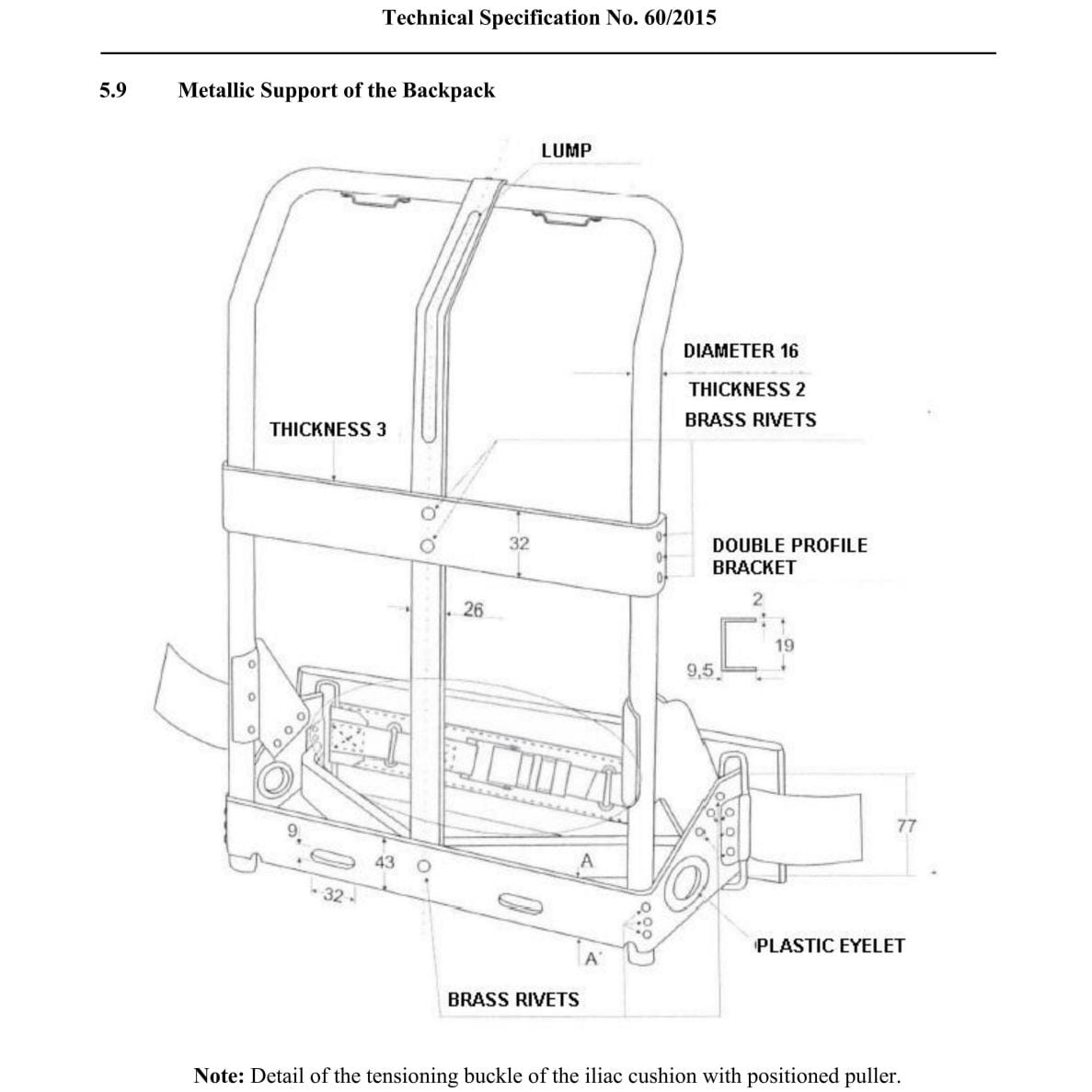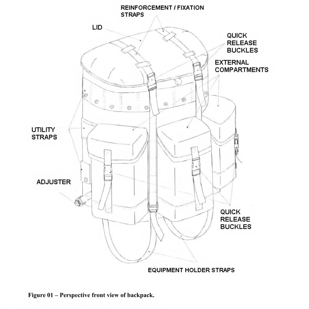 This medium-capacity military backpack is designed for field-carrying needs that require balanced storage, structural stability, and durable materials. The backpack features a total capacity of 31.55 dm³, with a main compartment and three external compartments for organized load distribution. Its structure integrates the main body, suspenders, iliac cushion, metallic support, reinforcement straps, and inner lining, making it suitable for military and mission-oriented use rather than standard commercial carrying.