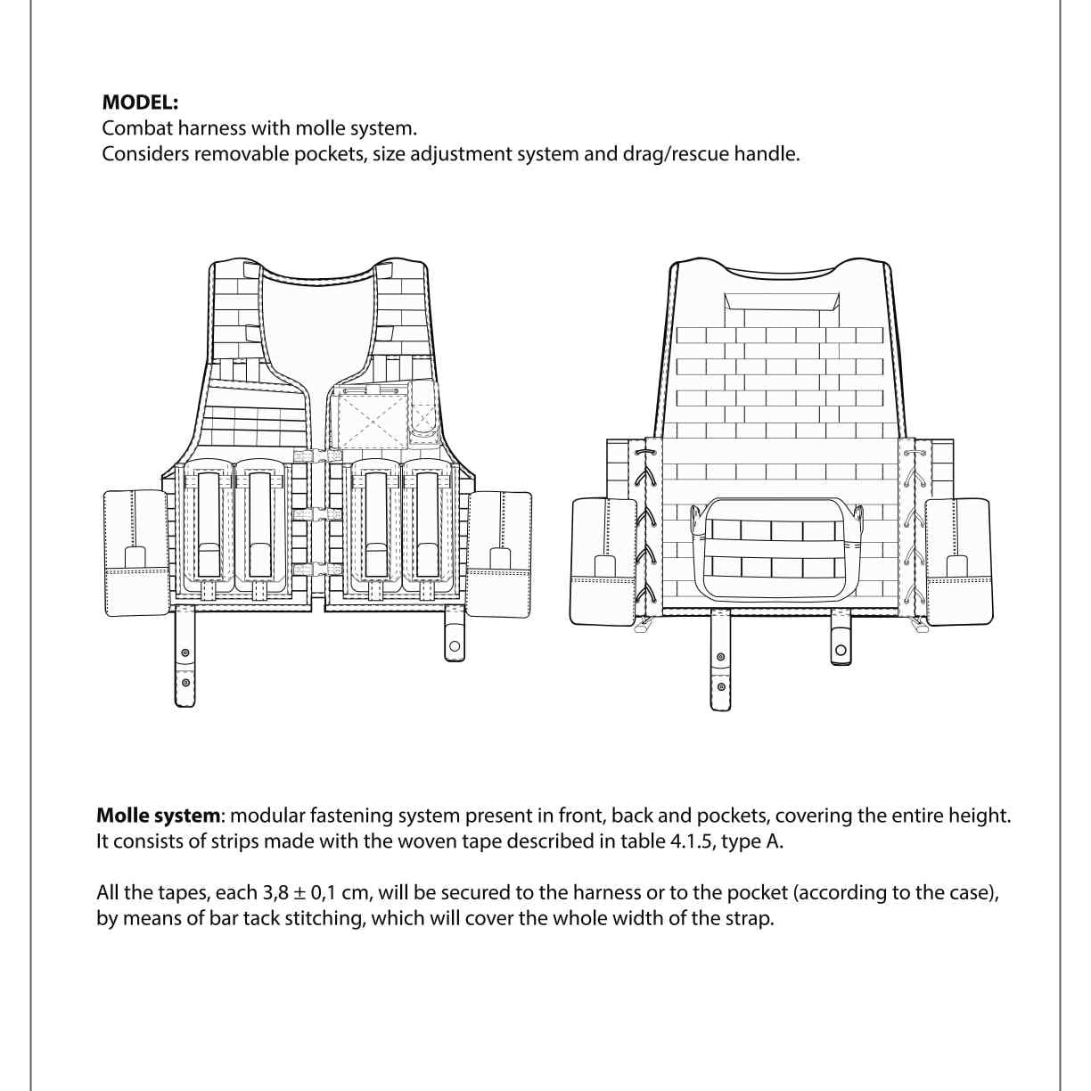 This tactical harness is a specification-based load-bearing vest designed for field use. The system features full MOLLE coverage on the front and back, removable pockets, shoulder and side adjustment, and a drag/rescue handle, supporting modular load carrying and structured equipment organization.